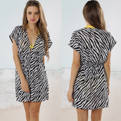 Zebra pattern style,with deep v-neck and gathered waist design,stylish and chic.