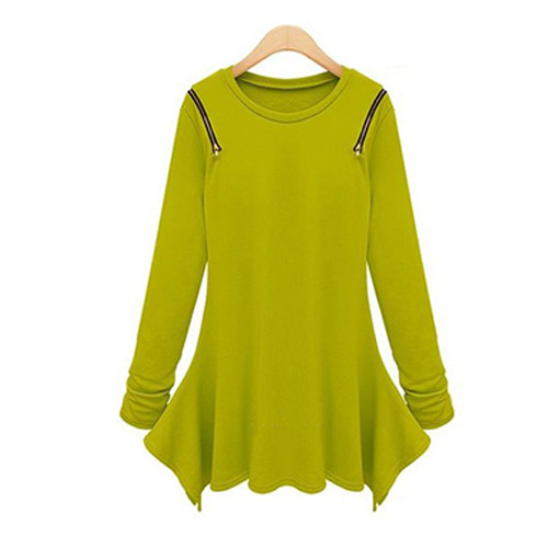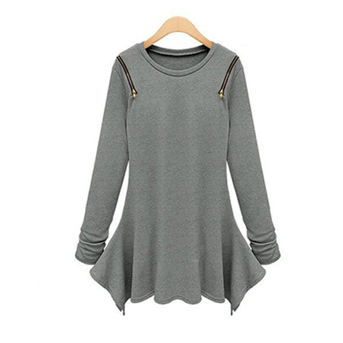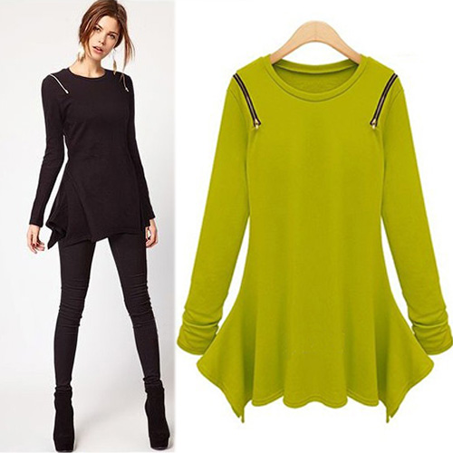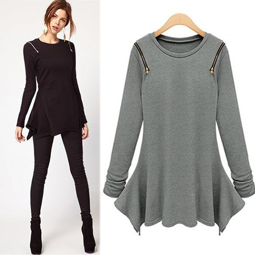 Crafted from cotton material,soft,breathable and comfortable to wear. Shoulder with zipper design,long sleeve,round neck and irregular hemline design,chic and elegant. You can pair it with your tight pants or leggings.