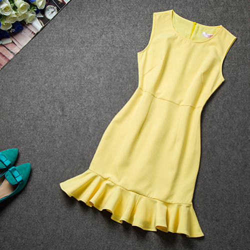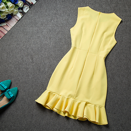 sleeveless dress is outfitted with a round neck,a fit silhouette and a flouncing