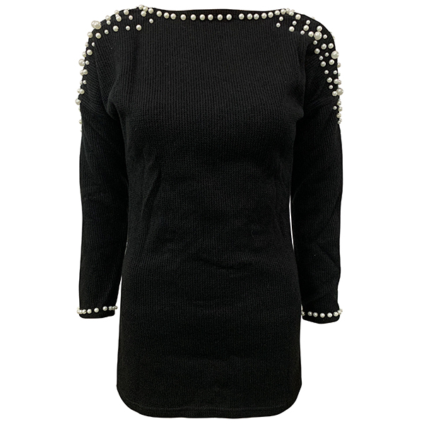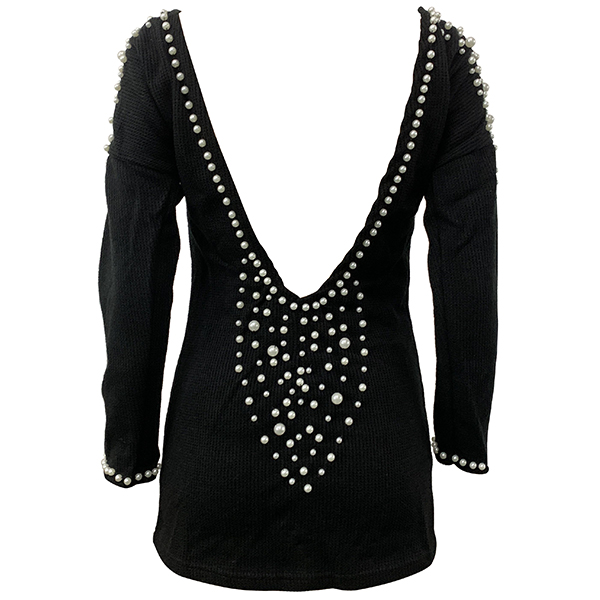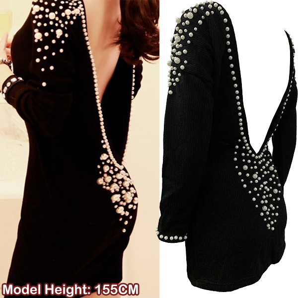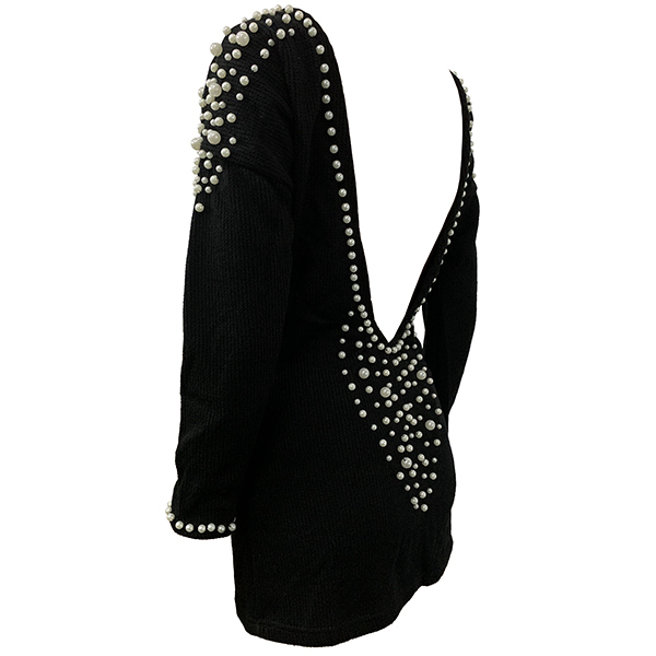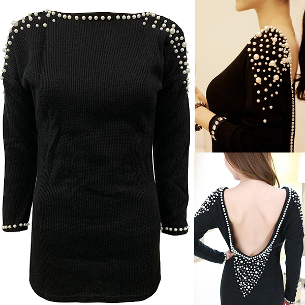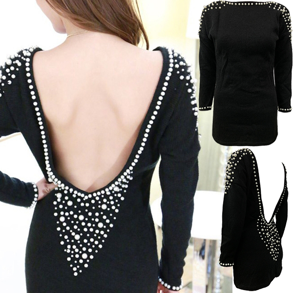 Luxury Boat Neck Faux Pearl Embellished Backless Long Sleeve Black Over Hip Club Dress
