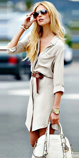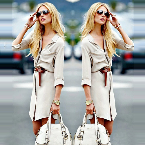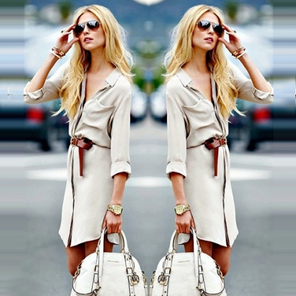 This long-sleeved shirt dress effortlessly blends classic and edgy styles for a unique look.