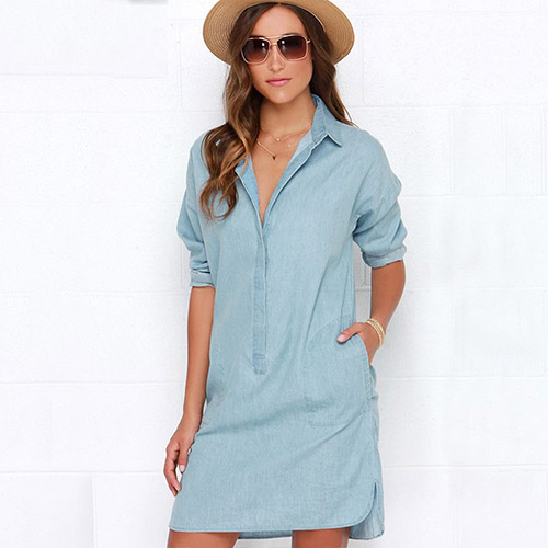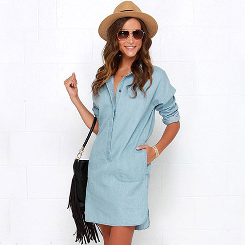 This long-sleeved denim shirt dress effortlessly blends classic and edgy styles for a unique look.