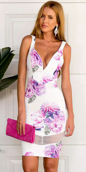 It features backless,asymmetrical v-neck and gauze spliced design,sexy and charming. Floral print