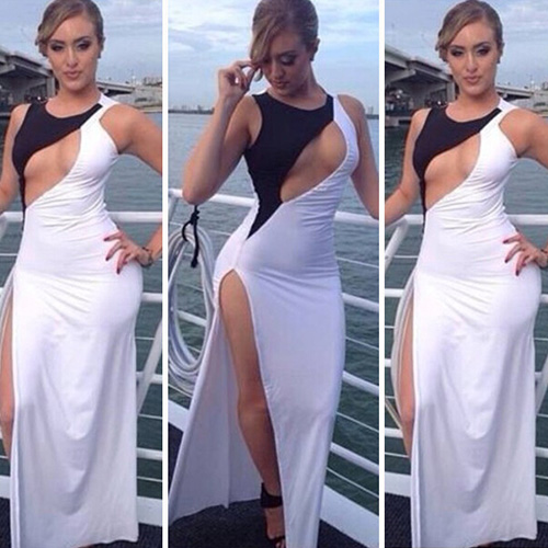 Sometimes,women should be bold enough to show your sexy and beauty through sexy dress. Look at this one,it features contrast color design,backless,hollow out design in chest part and hemline with high slit design. It is enough to show your beauty.