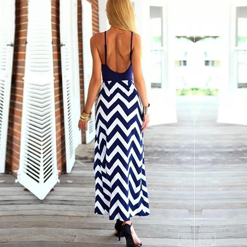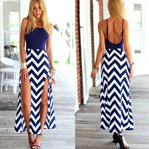 Sling style,with backless and slit hemline design,sexy and stylish. Wave-stripe