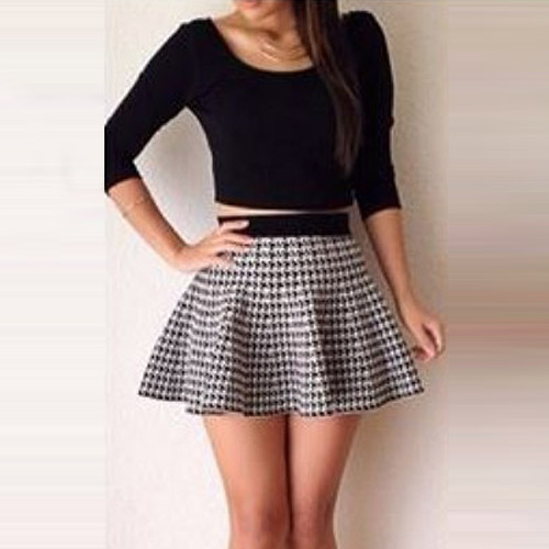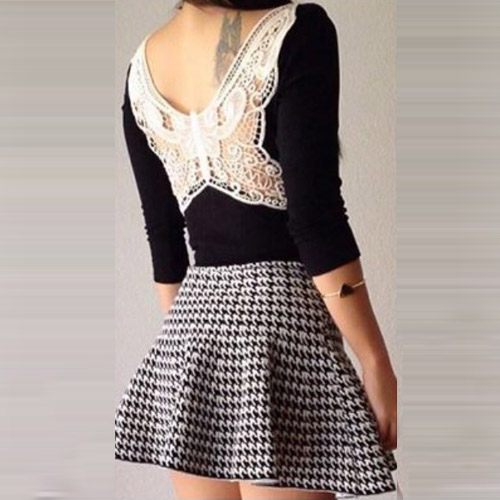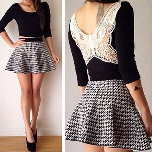 Tops with hollow out lace spliced and backless design. Skirts with high waist style.