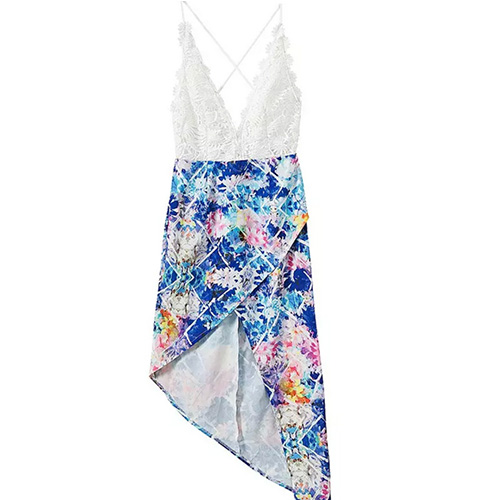with backless and deep v-neck design. Lace spliced and irregular floral print hemline design