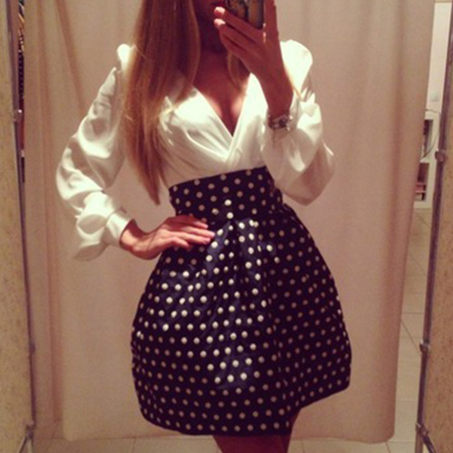 This dress features sexy deep v-neck design,fashion and charming. Contrast color style,hemline with dots pattern,combination of retro and fashion elements. Long sleeve and high waist design,perfect show your slender figure.