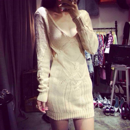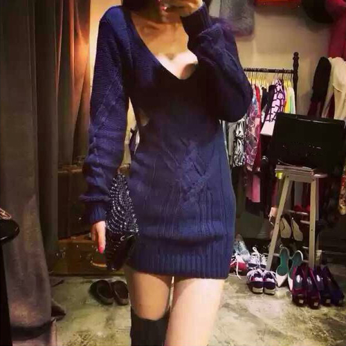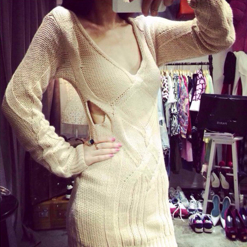 Wow,such a sexy and chic knitting dress. Once you see it,you will can't wait to want to buy it. It features solid color,long sleeve,sexy deep v-neck and hollow out waist design. Slim fit and package hip design. Pairing with boots would be perfect.
