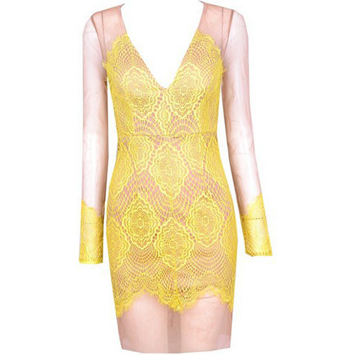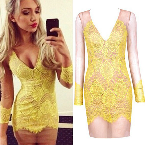 This lace dress features sexy deep v-neck style,long sleeve and hollow out lace spliced design. Slim fit and package hip design,perfect show your seductive curve.