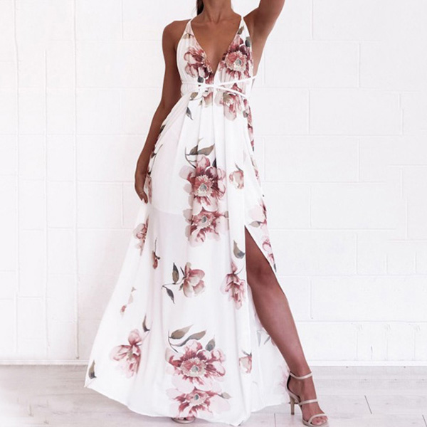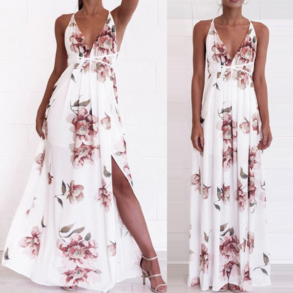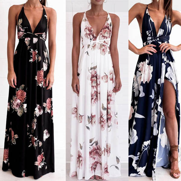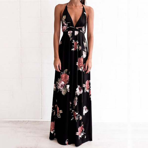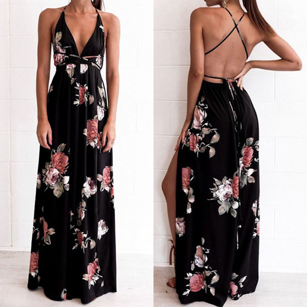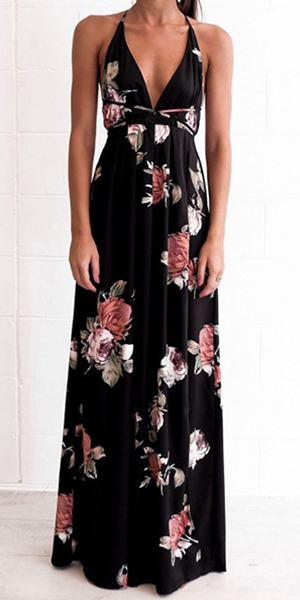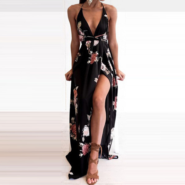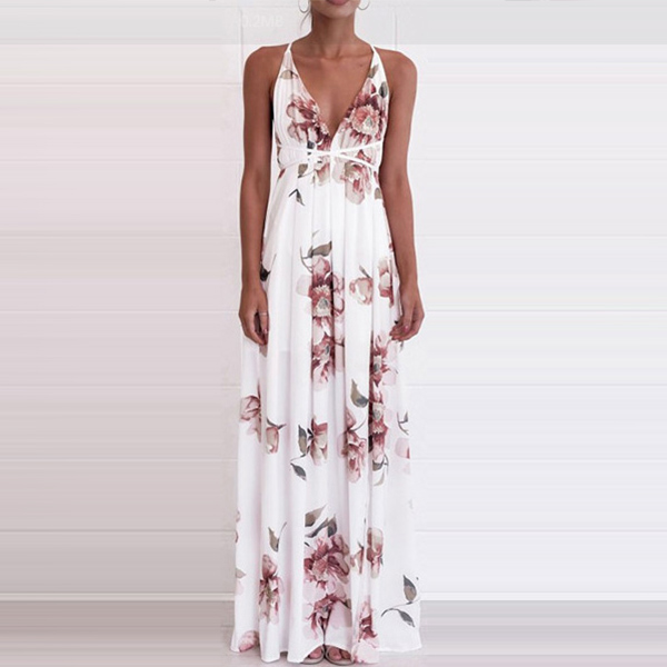 Sexy Deep V-neck Sleeveless Backless Printed Pattern Ruffle Hemline Dress