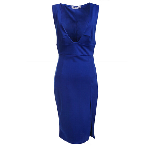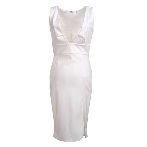 Let your beautiful skin and charming curve shine in this sexy dress. Featuring deep v-neck design,showing your seductive cleavage. Sleeveless,backside zipper,hemline with high slit design. Wear it to the party!
