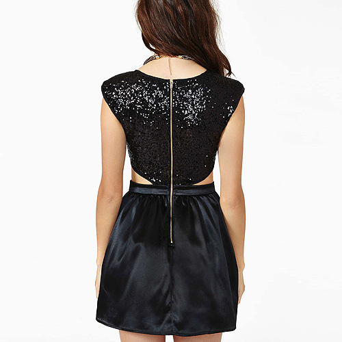 This dress features deep v-neck style,waist part with hollow out design,sexy and charming. Sequins spliced design,