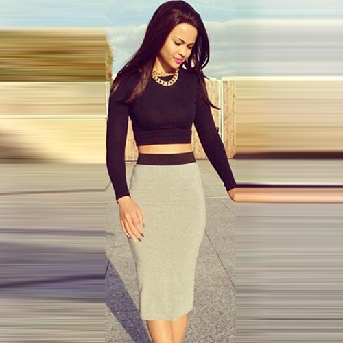 a black long sleeve tops and a gray high waist skirts. You look so charming in this two-piece dress.
