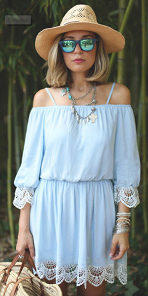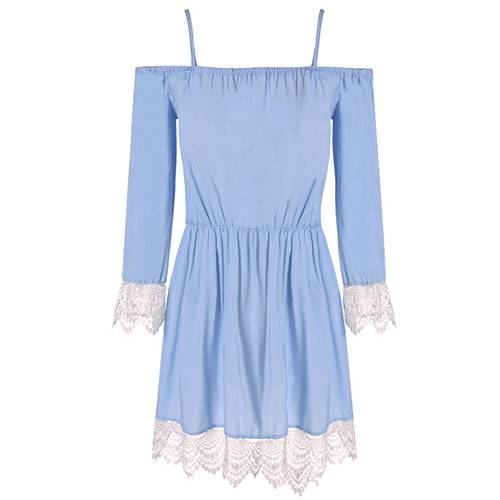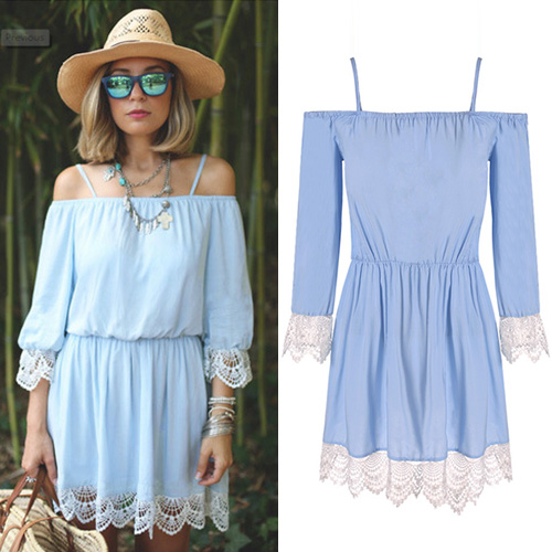 Sling style,with off-shoulder design,sexy and charming. Cuff and hemline with lace spliced design,