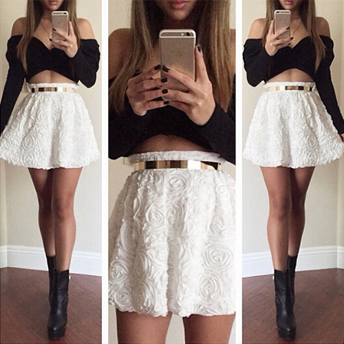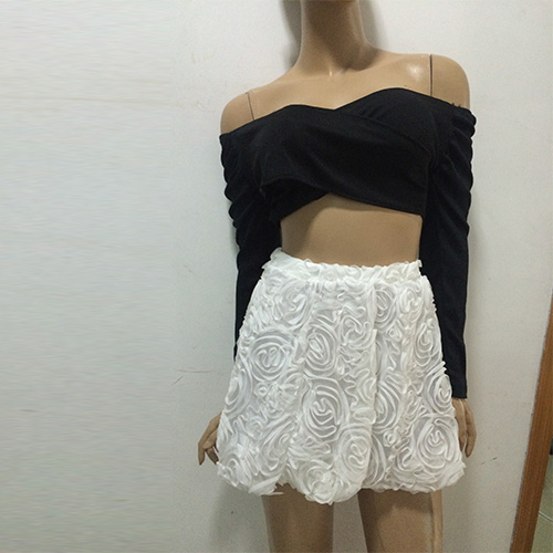 It consists of two pieces:off-shoulder long sleeve tops and 3D flowers skirts. Perfect for matching them together.