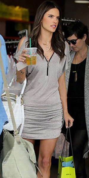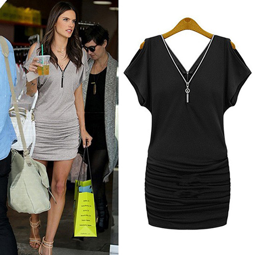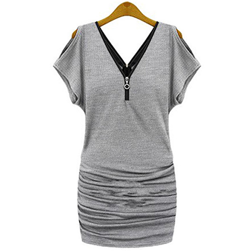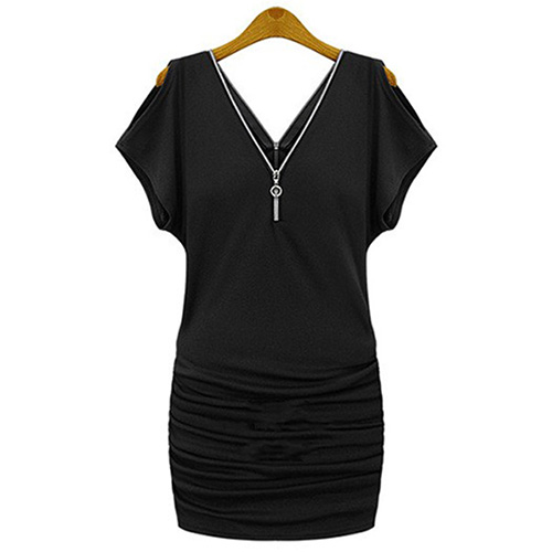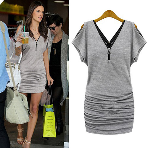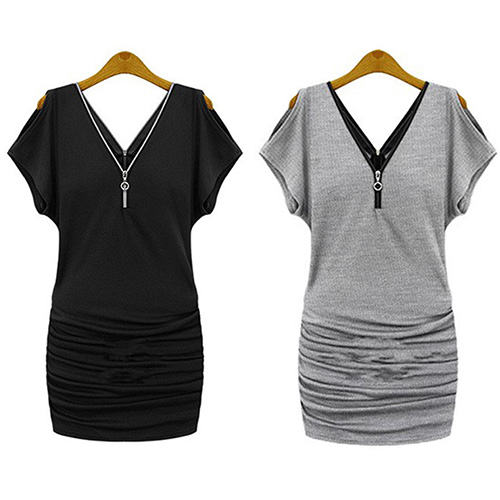 It features off-shoulder and v-neck design. Neckline with zipper design