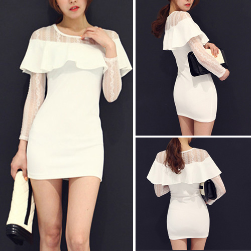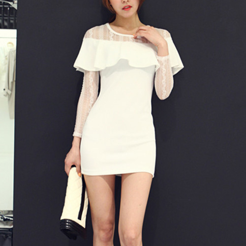 It is absolutely a good partner for you in this fall and it will bring you to the fashion road. Features see-through gauze spliced in sleeve and shoulder part,sexy and filmy beauty. Flouncing design,adding your femininity. Slim fit and package hip design,perfect show your charming curve. You can also pair it with your coat in cold days.