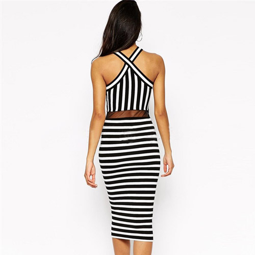Striped style,with halter design,sexy and stylish. Waist part with see-through gauze spliced design,