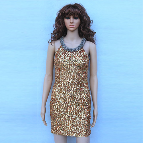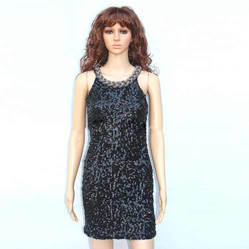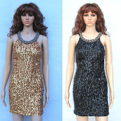 Take this sequins dress to party,you will certainly be the focus. It features chain neckline,sleeveless design,with sequins for decoration. Slim fit and package hip design,showing your perfect figure.
