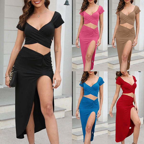 Two-piece style,including a sleeveless crop tops and high waist irregular bust skirt.