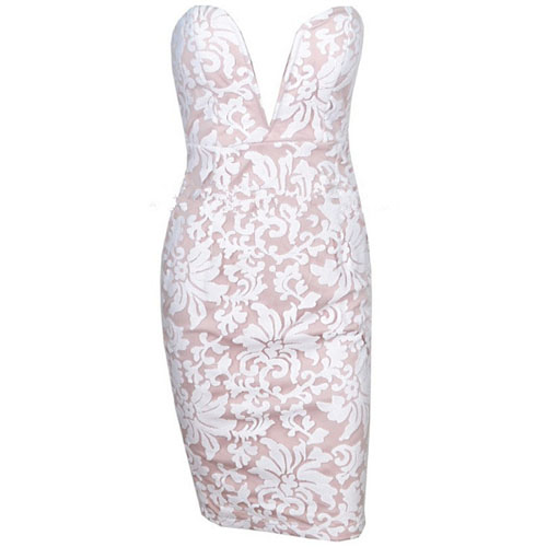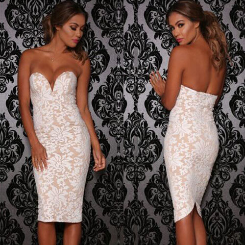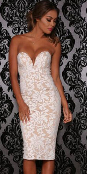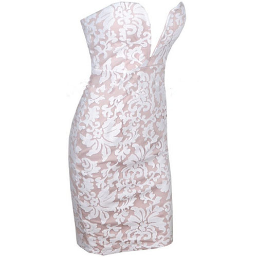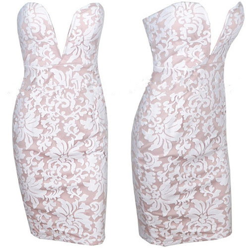 you'll love this dress. With an allover lace pattern,with strapless and deep v-neck design,this