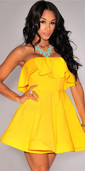 Let your dress do the flirting for you in this strapless dress. Finished with a flouncing neckline and