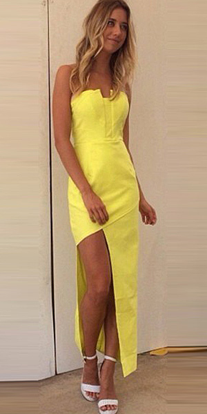 Features bright yellow color,can perfect set off your fair skin. Strapless style,with slim fit and irregular