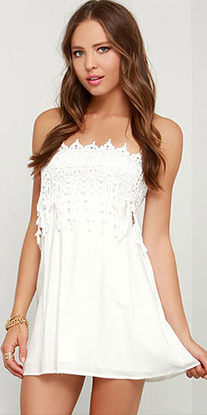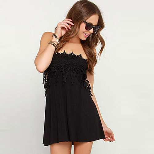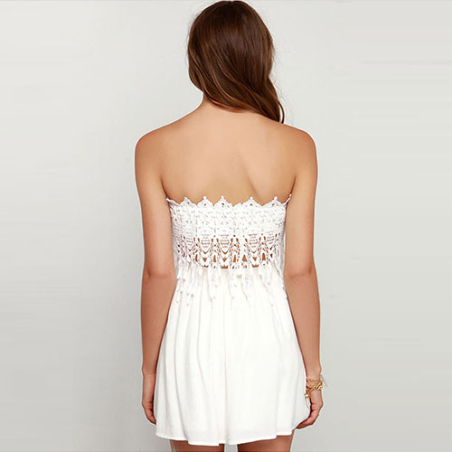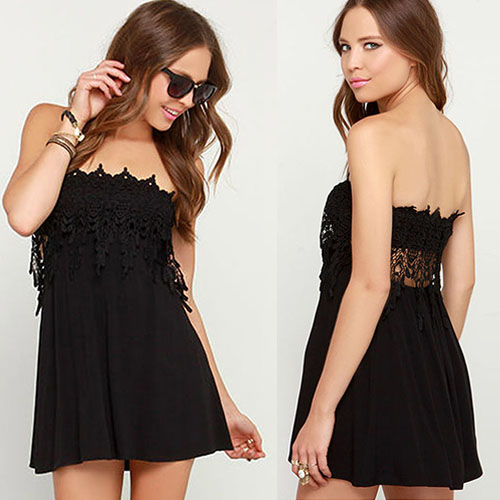 Update your wardrobe with this strapless dress! Solid color style,with lace spliced design