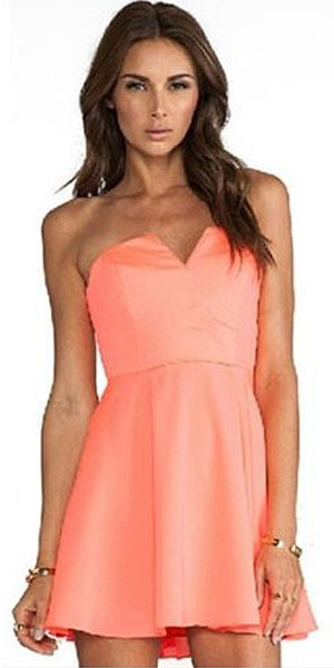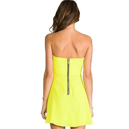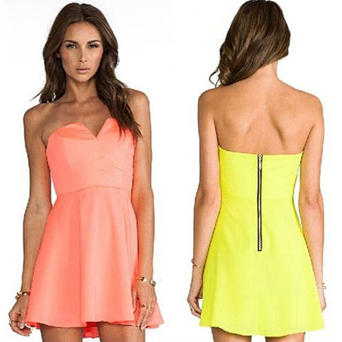 This dress features bright color,can perfect set off your fair skin. Strapless style,with solid color and