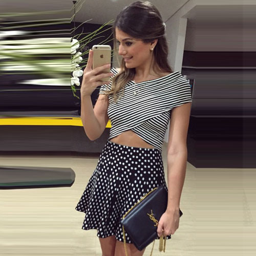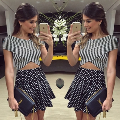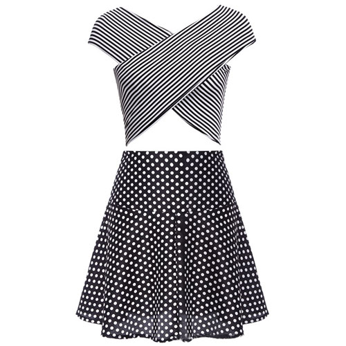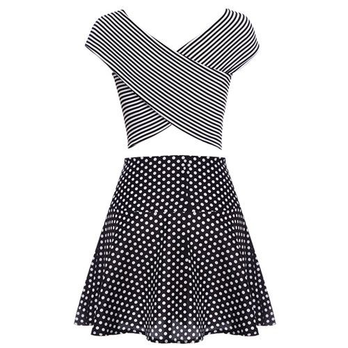 Striped tops,with crossover design,chic and stylish. Skirt with dots pattern,high waist design,