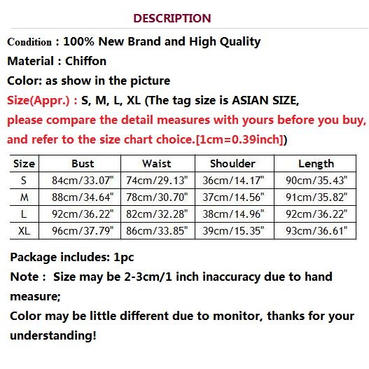 XL : Bust : 96cm(37.8"); Waist : 86cm(33.86"); Shoulder : 39cm(15.35"); Length : 93cm(36.61");