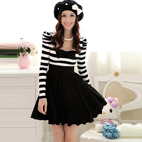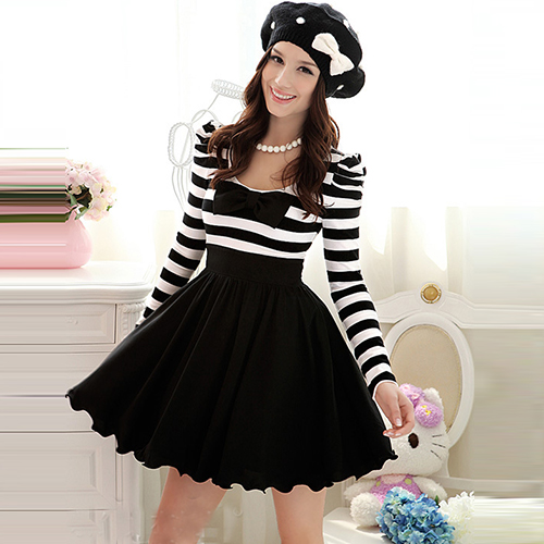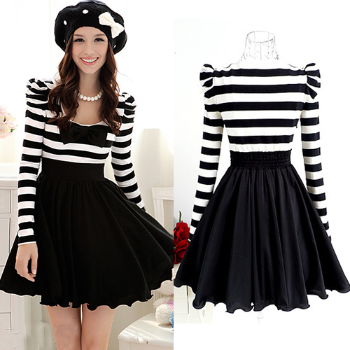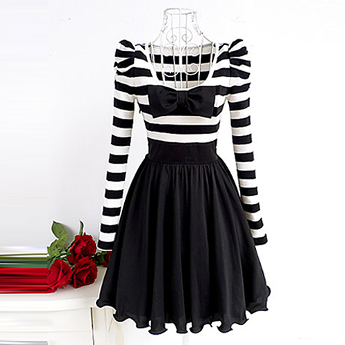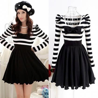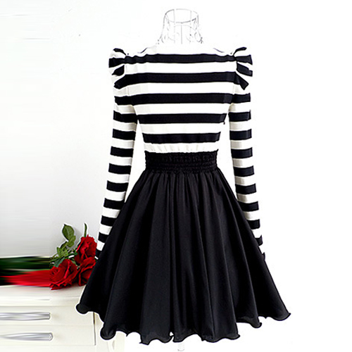 This dress features black&white stripes spliced design,chiffon hemline,stylish and glamorous.