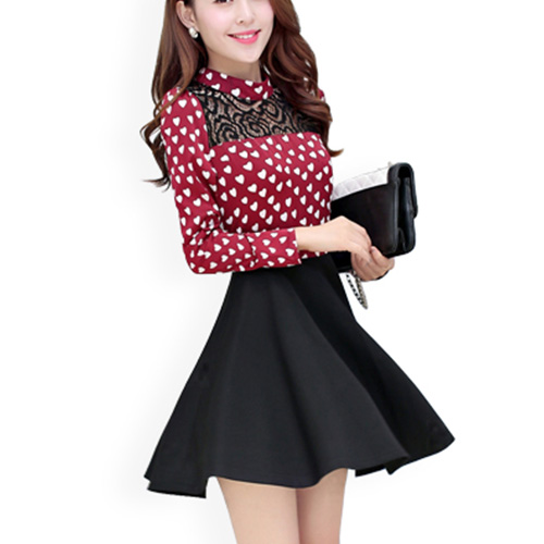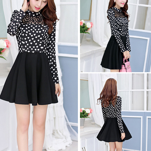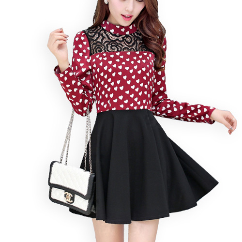 No matter when and where,this dress will make you be the focus. It features hearts pattern,sweet and romantic. Chest part with see-through lace spliced design,flowing hemline,gathered waist and slim fit design,showing your charming curve.