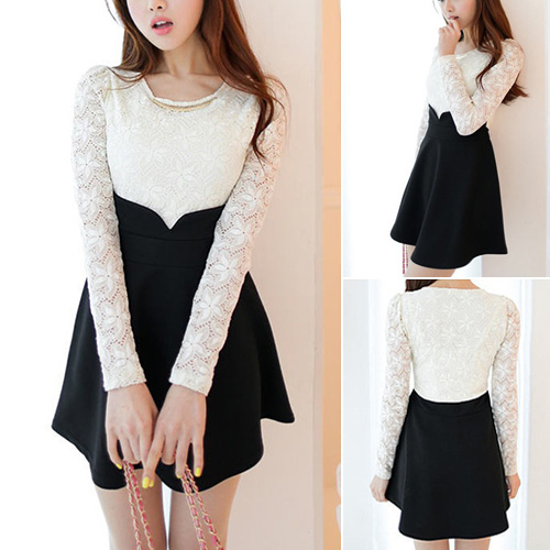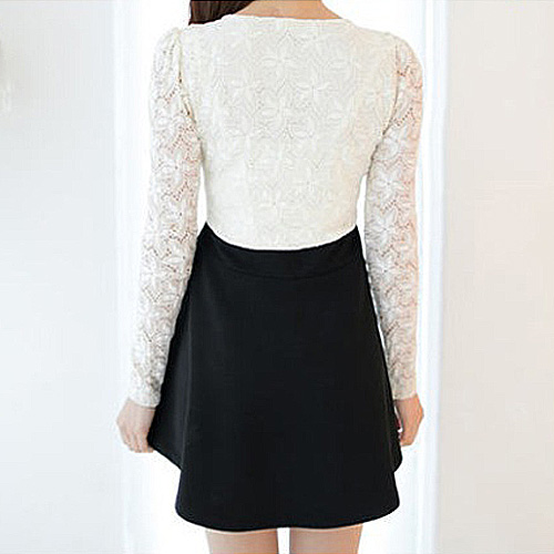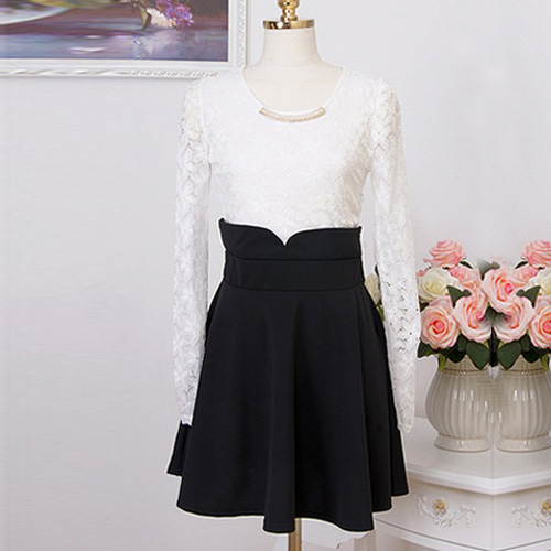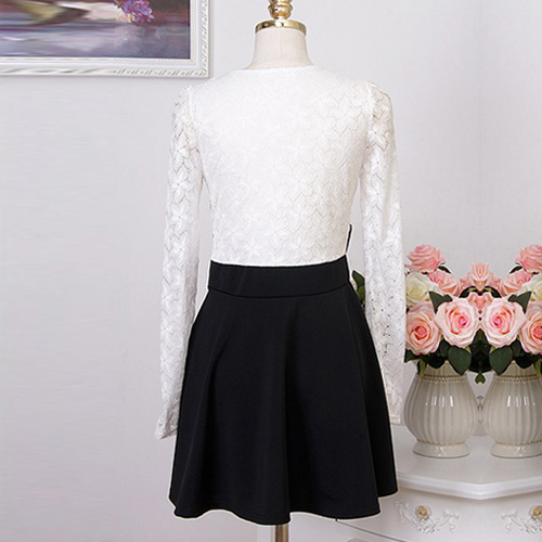 This dress features contrast color style,with long sleeve,round neck,high waist and lace spliced design,