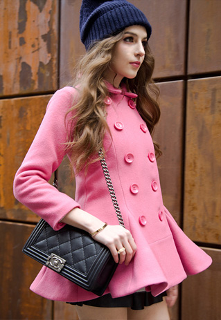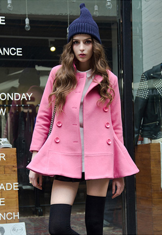 Show your elegant temperament and sweet flavor through this woolen coat. It features sweet pink,double-breasted and elegant flouncing hemline design. You can pair it with your leggings and over-the-knee boots to express your beauty.