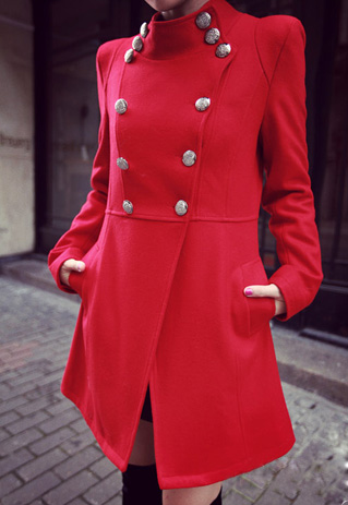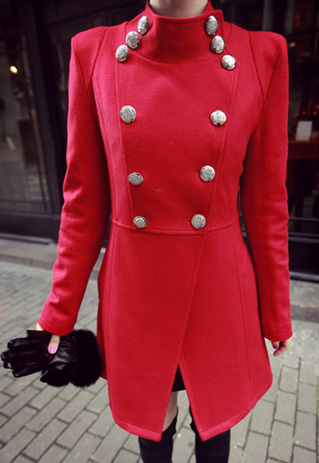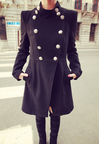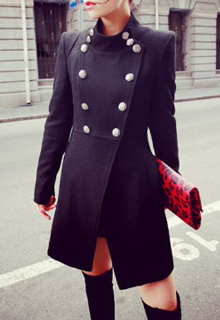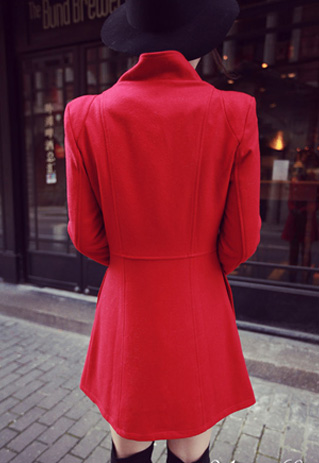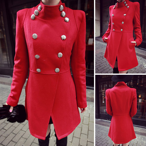 Show your elegant temperament and slender figure with this woolen coat. It features solid color,double-breasted style,collar with decorative buttons. Unique V shaped hemline makes it more chic. Wear it to catch the envious eyes.