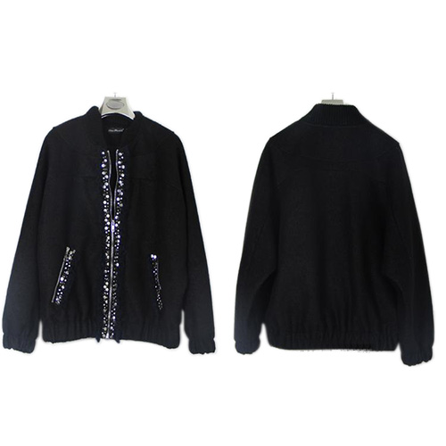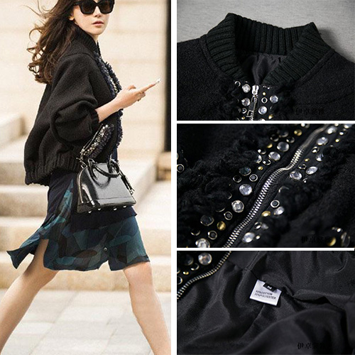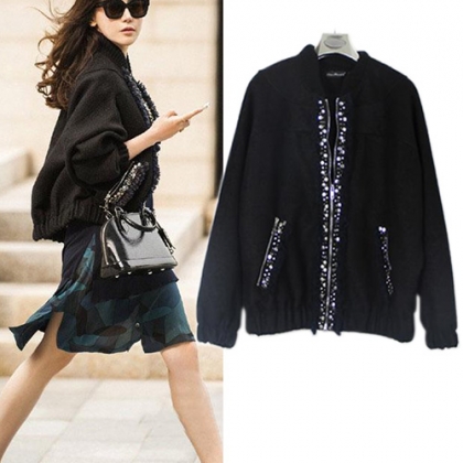 This woolen coat with fashion stand collar,elastic hemline,zipper closure,long sleeve design. Zipper and pockets with dazzling beads for decoration. It will make your winter dazzling and warm.