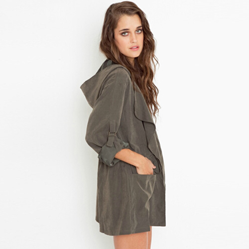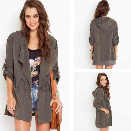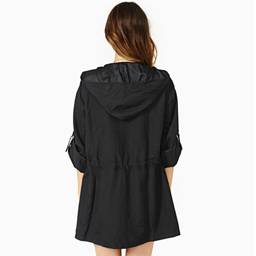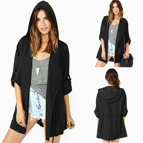 This trench coat features solid color style,long sleeve which can be rolled up. Hooded and gathered waist design. Waist part with drawstring design. Front with lapel,two hand pockets. Comfortable to wear.