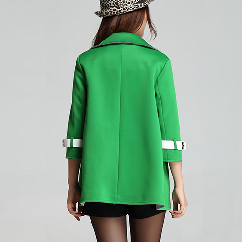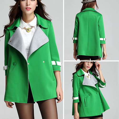 Showcase your charming femininity in this chic coat. It will make you be the focus no matter when and where you are. It features bright green color,contrast color lapel,double-breasted design. Unique 3/4 sleeve design,cuff with belt buckle for decoration. It will bring happy time for you.