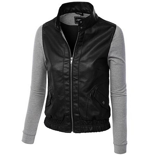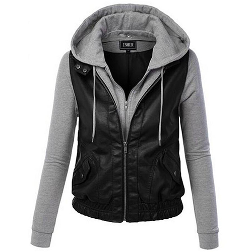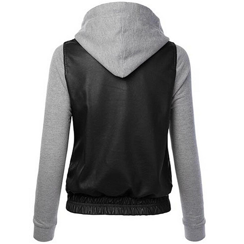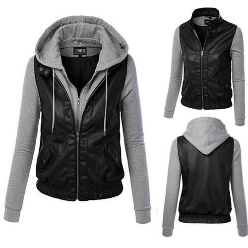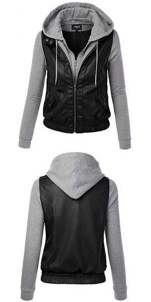It features PU leather spliced style,with all the classic details such as long sleeve,hooded,
