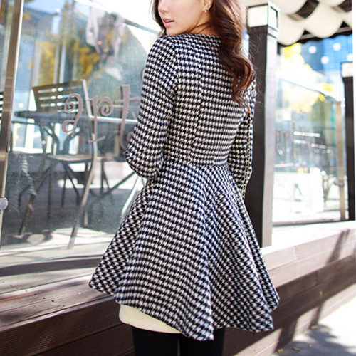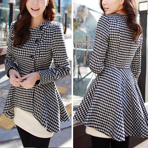 Features Houndstooth pattern,which is always popular in fashion stage. Single-breasted style,front with lapel design. Irregular and flowing hemline make this coat more chic and fashion. Pairing it with your leggings and sexy high-heeled shoes would be perfect.