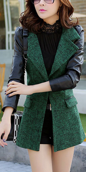 and charming style. Contrast color style,with PU leather spliced long sleeves,notched lapel and a sleek