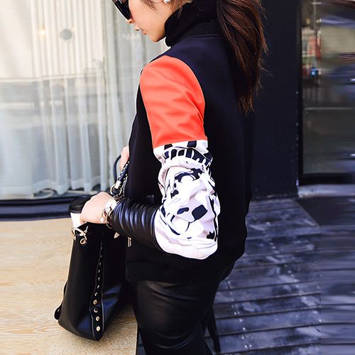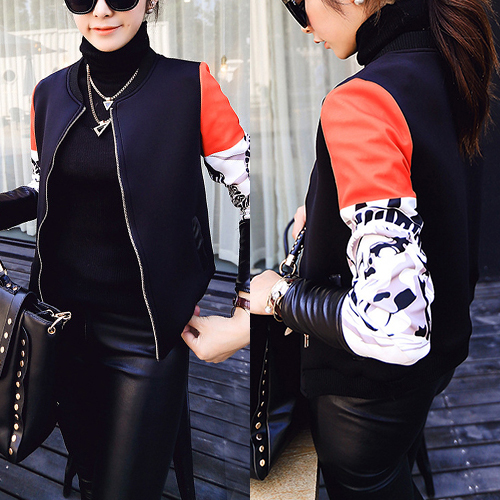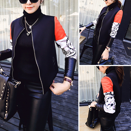 Contrast color style,sleeves with PU leather spliced design. Front zipper closure makes it easy to wear off.