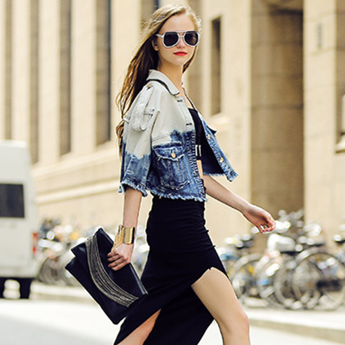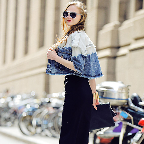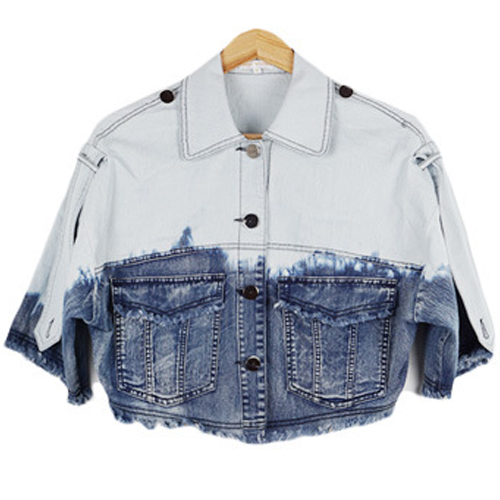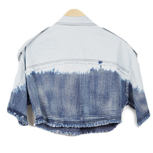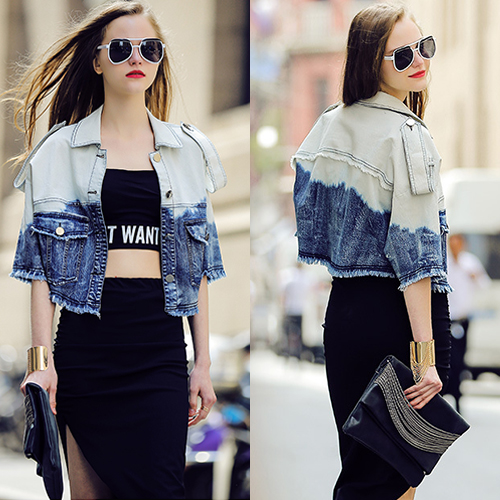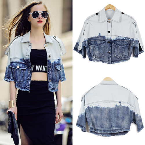 The denim jacket features turn-down collar, long straps, batwing half sleeve and chest pockets with