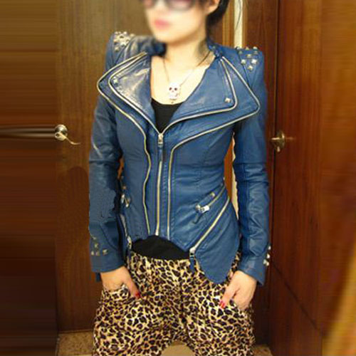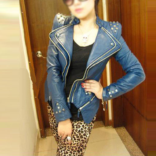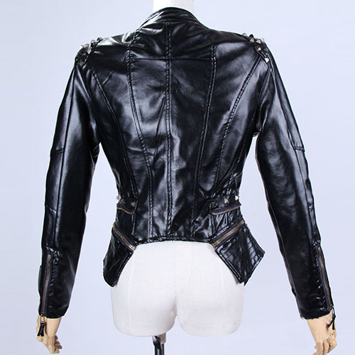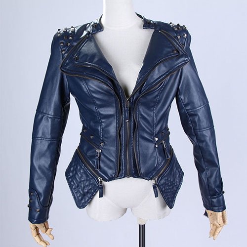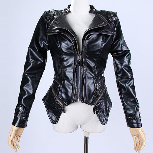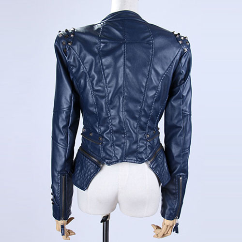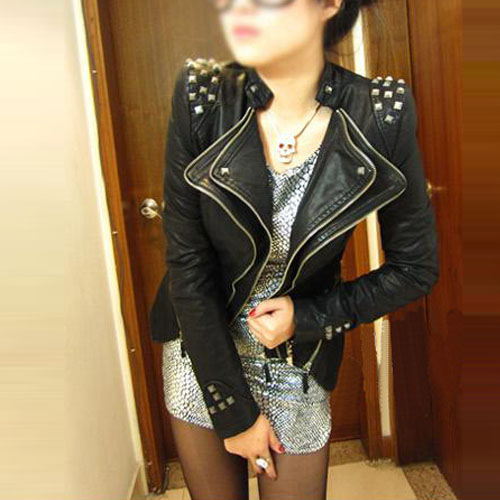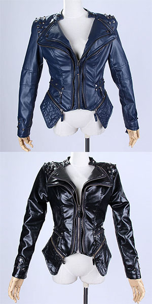 with long sleeve,lapel and zipper front. Rivets for decoration adds some retro elements.