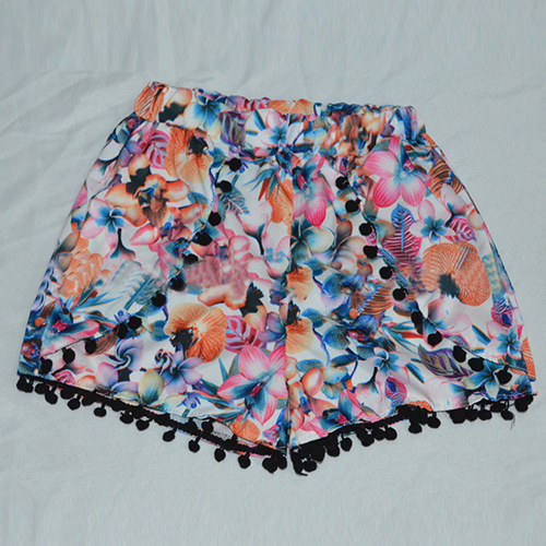 This shorts features floral print pattern,sweet and stylish. Hemline with pompoms for