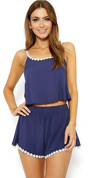 Two-piece style,including a Cami tops and shorts. Lace spliced design makes it