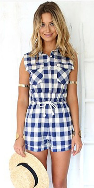 Fashion POLO Collar Sleeveless Gathered Waist Plaid Rompers