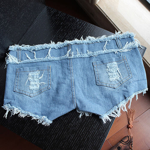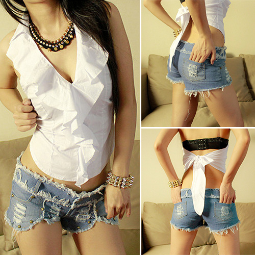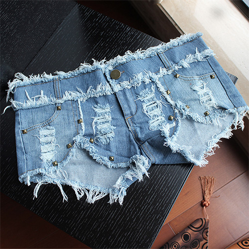 with rivets and ripped design. Low-waist and irregular hemline design makes it so sexy and seductive.